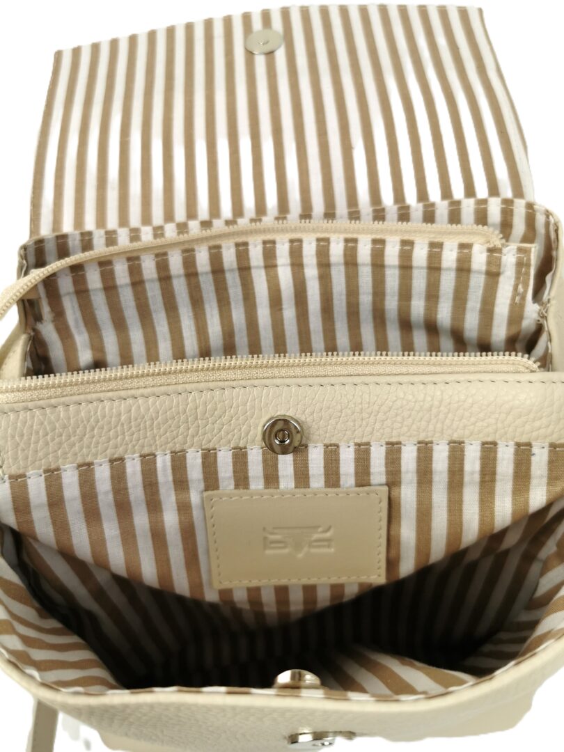 - Belső elrendezés : 3 rekeszes. A középső rekeszben egy cipzáras zseb és telefon tárolására alkalmas rekesz található, mely cipzárral záródik. A két szélső rekesz mágneszárral záródik.